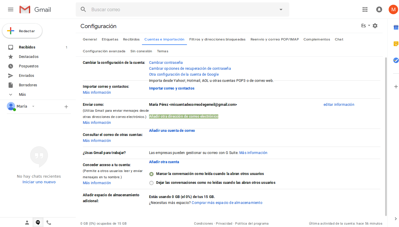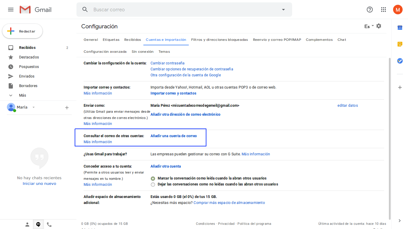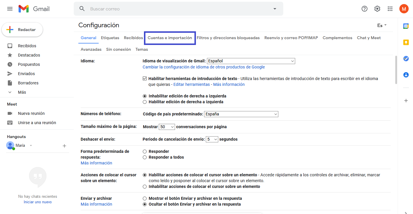 - Pulsar en Ver todos los ajustes te llevará a la sección Configuración. Dentro de Configuración verás varias pestañas (General, Etiquetas, etc.). Pulsa sobre Cuentas e importación: