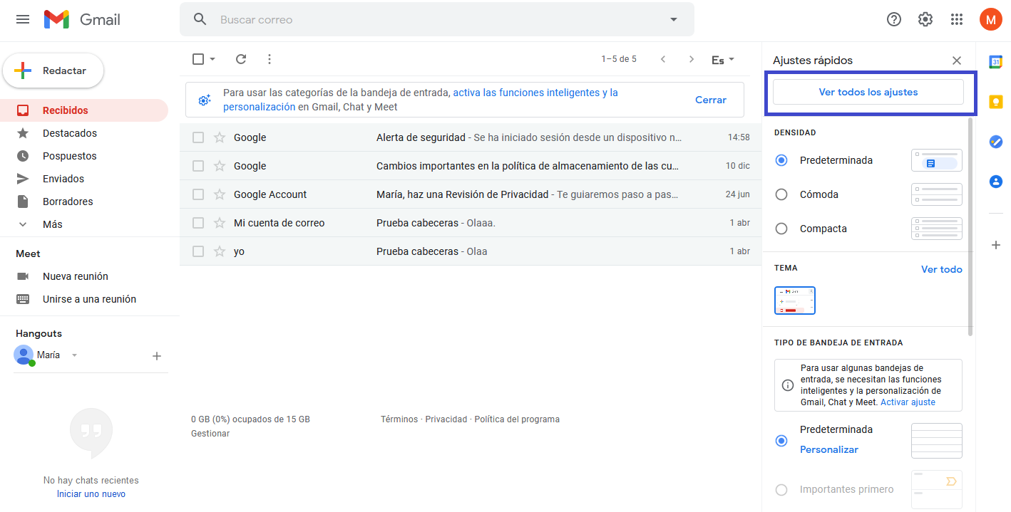 - Una vez dentro, arriba a la derecha verás una rueda dentada. Pulsa en ella y luego de nuevo en Ver todos los ajustes: