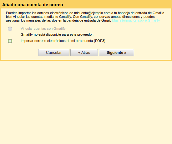 Pulsa la opción Importar correos electrónicos de mi otra cuenta (POP3) y luego Siguiente: