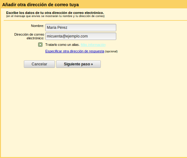 Asegúrate de desmarcar la opción activada por defecto Tratarlo como un alias. Pulsa Siguiente paso: