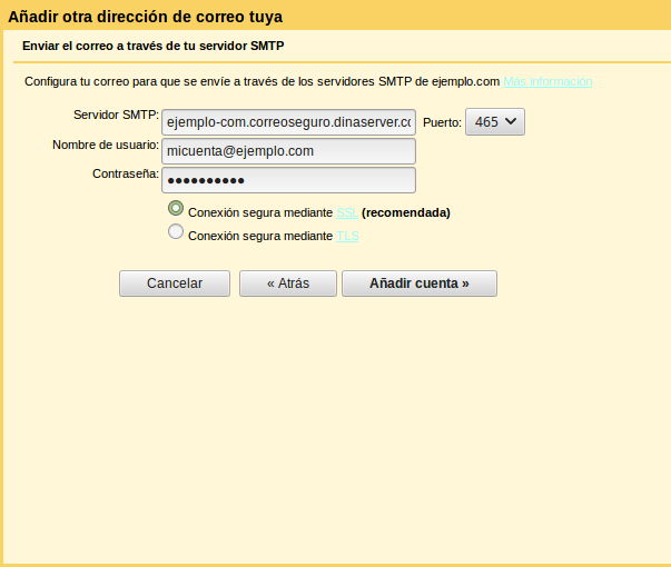 A continuación, vamos a configurar el correo mediante SSL, para mayor seguridad. Para ello, vas a necesitar conocer los datos de configuración SSL de tu cuenta de correo.