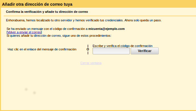 Ya has añadido todos tus datos. Si todo está correcto, el asistente te permitirá continuar y Gmail enviará un email a la cuenta que has configurado con un código de confirmación.