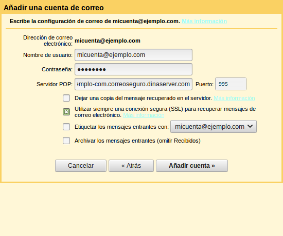 A continuación cubre la información seleccionando el puerto 995 (POPS) para usar conexión cifrada.